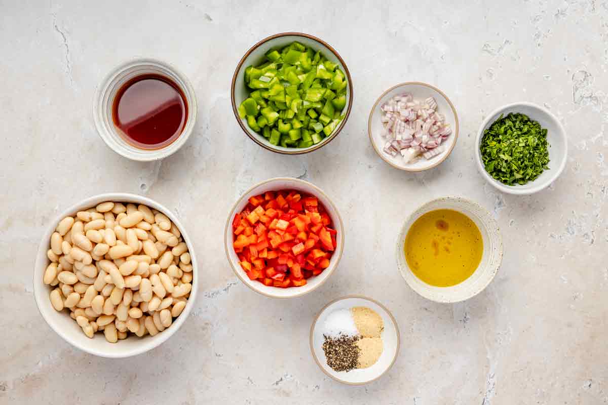Simple white bean salad with marinated cannellini beans, freshly chopped onion and peppers, olive oil, and red wine vinegar. A healthy, no-cook summer salad that’s also a great dip. A great little meal prep friendly, protein-packed side dish.